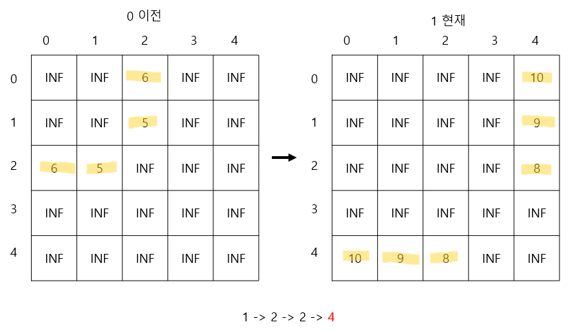 dp[1][i][next] = Math.min(dp[1][i][next], dp[0][i][j] + cost(j, next));